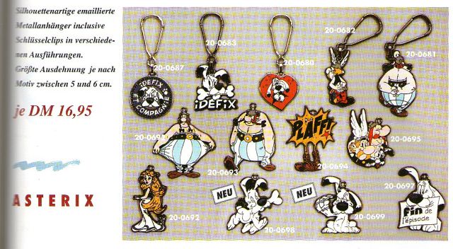 ich habe jetzt im Hummelcomickatalog von 1998 passende Angaben zu der Serie gefunden, siehe Anhang. Der von Marco in der Bibliothek genannte Preis bezieht sich auf den Katalog von 2000, dort wurden die restlichen Exemplare für 10,- DM abverkauft, vorher war bereits im Katalog 1999 der Preis auf 14,95 DM gesenkt worden. Da die Nummern leider nicht auf den Schlüsselanhängern stehen kann ich die verbleibenden Motive nicht zuordnen, klar ist nur, dass die Angabe mit der fortlaufenden Nummerierung falsch ist, ebenso die Angabe mit den Jahreszahlen, mein Schlüsselanhänger von Idefix et Companie hat den Aufdruck 1995,