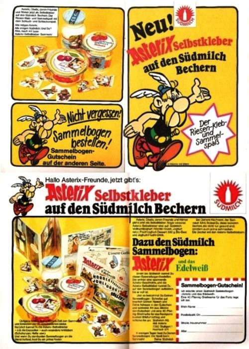 gerade wieder in den Sinn gekommen ist mir diese alte und an Asterix-Motiven reiche, sehr hübsche, auch definitiv im Handel erhältlich gewesene, weil fest eingeheftete, vierseitige Südmilch-Beilage mit Gutschein(!), weshalb ich immer mehr zur Überzeugung gelange, diese - ganz der dortigen Argumentation von Erik folgend - doch bitte ans Ende der ToDo-Liste setzen zu lassen, zumal sie bestimmt etwas eher Außergewöhnliches in dieser Hinsicht darstellt und man nur allzuleicht wieder darauf vergißt! ;-) - Der Thread wurde leider seinerzeit ohne abschließendes Kommentar gesperrt, weshalb ich nun ganz im Sinne Deiner Vorgangsweise einen neuen Thread dazu eröffnet habe, da sie nach heutigen Maßstäben als (mit-)erwerbliche Asterix-Sonderpublikation samt Kupon für den Extra-Bogen doch den Aufnahmekritrien für den Mindestfall einer Erwähnung auf der Sammelbilder-Seite von Südmilch genügen sollte.. :-)
