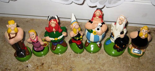 - Set 8 Figuren (Abb. rechts, mit Asterix, Obelix, Miraculix, Majestix, Gutemine, Verleihnix Automatix und Troubadix)