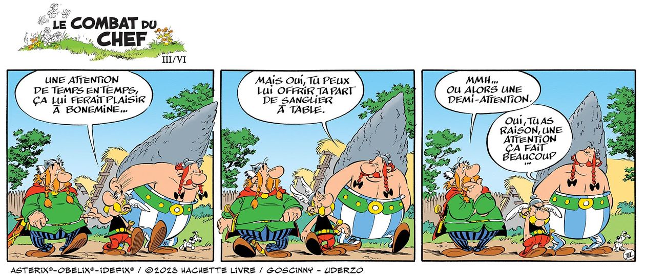 Panel 3: Obelix: "Ja, du hast recht, deine ganze Aufmerksamkeit wäre schon etwas viel:"