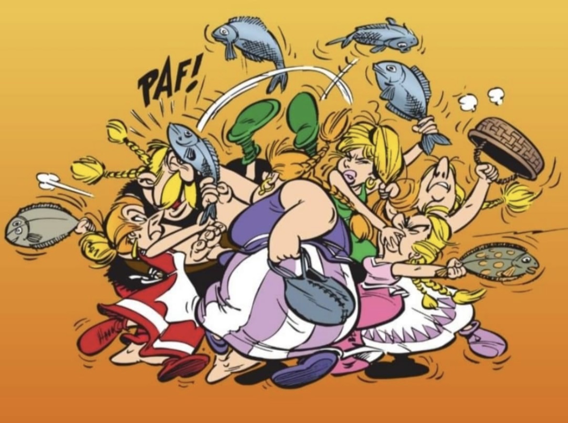 Dass Falbala jemals in eine richtige Prügelei verwickelt gewesen wäre, ist mir nicht bekannt. Allerdings gibt es zwei Szenen, wo sie ganz kurz etwas handgreiflich wird: