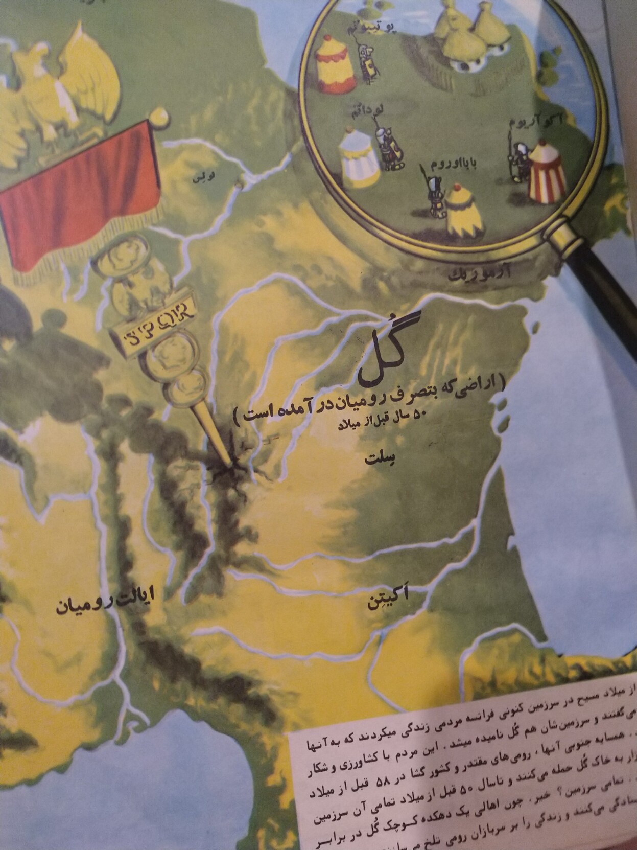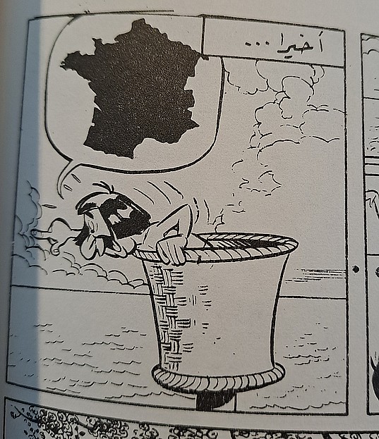 Hier noch zweimal die Gallien-Hieroglyphe, richtigrum, aus einer ägyptischen und eben der genannten iranischen Ausgabe. Die Chance, es richtig hinzukriegen, liegt bei den Herausgebern von Asterix in Sprachen mit Rechts-nach-Links-Schriften über den Daumen gepeilt bei 50%