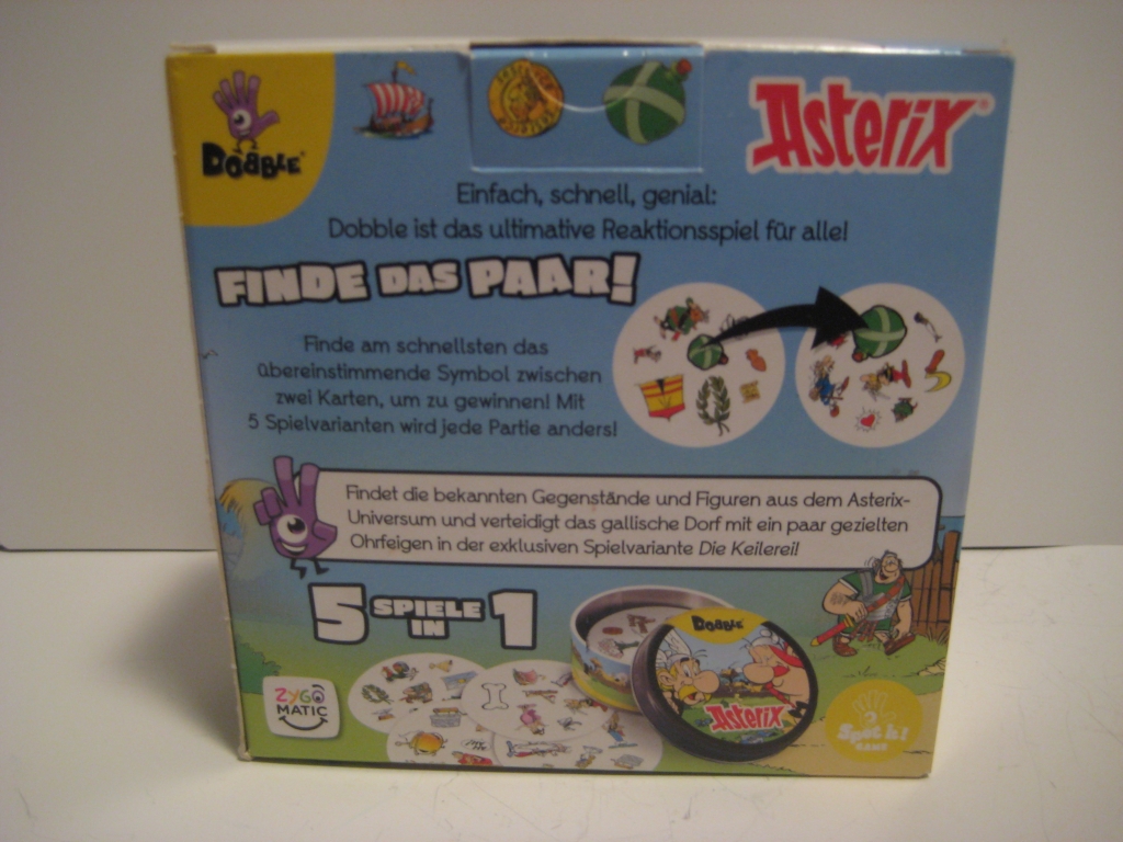 es gibt seit einiger Zeit das Spiel Dobble Asterix - Finde das Paar!, der Preis liegt bei ca. 16,99 €, Das Spiel enthält 55 Karten in einer Blechdose und es geht darum, bei zwei gezogenen Karten am schnellsten herauszufinden, welches Symbol auf beiden Karten abgebildet ist. Dazu gibt es noch weitere Spielvarianten.