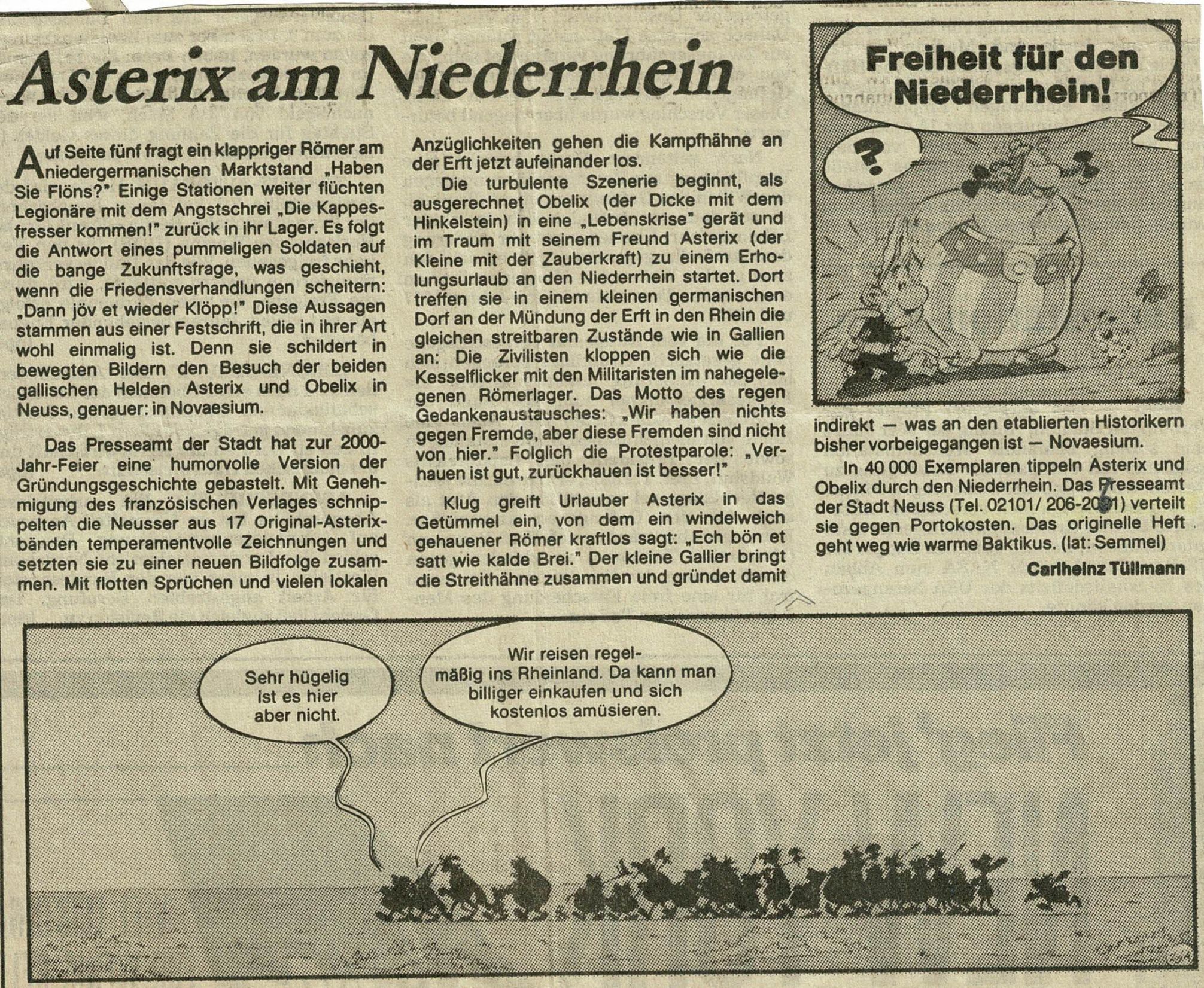 Wenn man nach dem Namen des Autors googelt, stösst man auf eine Traueranzeige der Rheinischen Post aus 2012, für die Herr Tüllmann demnach über 40 Jahre gearbeitet habe. Hätte nach dem Layout und Typografie auch ohne diesen Fund auf die RP getippt, die hatten meine Eltern zu der Zeit abonniert und es war damals wie in reduzierter Form heute noch die massgebliche Tageszeitung in um Düsseldorf herum.
