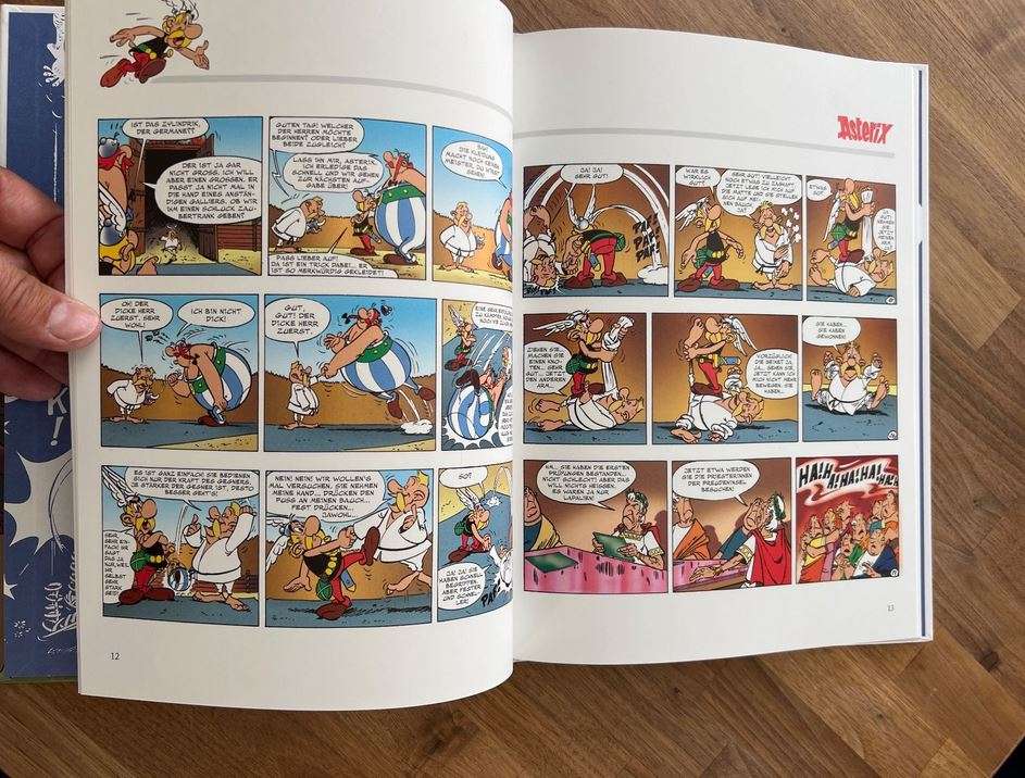 Insgesamt scheint das ein sehr liebevolles und hochprofessionelles Werk zu sein. Allerdings finde ich etwas schade, dass dass ausgerechnet der Titel nicht von Comixene übernommen wurde (der lautet nämlich "12 Prüfungen für Asterix. Auch als Cover fände ich das von Comixene oder des französischen Albums besser weil originalgetreuer. Wenn der Band jetzt noch zum Selbstkostenpreis, meinetwegen mit einer gewissen Entschädigung für die (bestimmt umfangreiche) hervorragende eigene Arbeit, angeboten würde könnte man es als umfassend positiv zu bewertendes tolles Werk eines Fans einordnen, der die Lücke schließt, dass es keine Albumausgabe und nicht einmal eine deutsche Farbversion gibt. Und dabei das tut, was ich gerne täte, wozu ich aber technisch nicht in der Lage bin. (Ich habe oft mit dem Gedanken gespielt, Lupo- und MV-Ausgaben zu eigenen Alben zu fabrizieren, allein, mir fehlen die Fähigkeiten.)