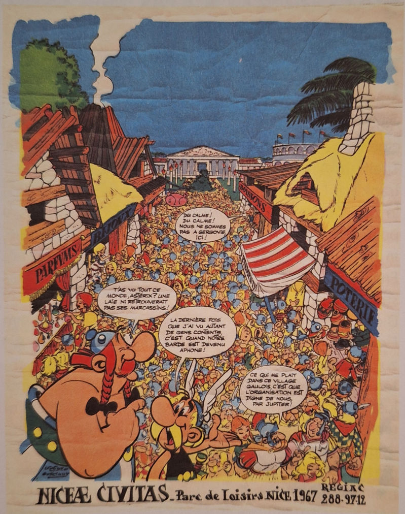 Das legt es nahe, dass es um einen Park im Sinne einer zeitlich begrenzten Veranstaltung mit Marktbuden gehen sollte. Auch die Plakatunterschrift "Parc de Loisirs NICE 1967" deutet ja auf eine zeitlich begrenzte Veranstalung hin.Immerhin erregte ein Antrag zur Gründung eines Asterix-Parks in der Nähe von Nizza ihre Aufmerksamkeit. [...] Die Autoren von Asterix erteilten ihr Einverständnis und entwarfen sogar ein nettes Plakat, auf dem Gallier und Römer frühlich vereint durch die Gassen strömen! Leider war das Ergebnis eine Katastrophe: Die Autoren entdeckten lediglich einige Verkaufsbuden, die mit vage römisch anmutenden Helmen und entfernten Anspielungen auf ihren Comic geschmückt waren.