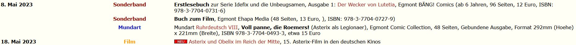 bei Amazon ist das Erscheinungsdatum des Erstlesebuchs auf "31. Dezember 2099" geändert worden. Das könnte darauf hindeuten, dass das Projekt auf Eis gelegt worden ist und das Buch nicht erscheinen wird.Erik hat geschrieben: 5. März 2023 18:01Auf der Neues-Seite von Comedix.de (https://www.comedix.de/news/index.php) werden das "Album zum Film" angekündigt, aus dem hier im Thread schon Auszüge gezeigt wurden (ISBN: 978-3-7704-0498-8), und ein Erstlesebuch zum Film mit der ISBN 978-3-7704-0727-9. Dieses letzgenannte wird bei Amazon.de als "Asterix - Im Reich der Mitte - das offizielle Buch zum Film" angekündigt.