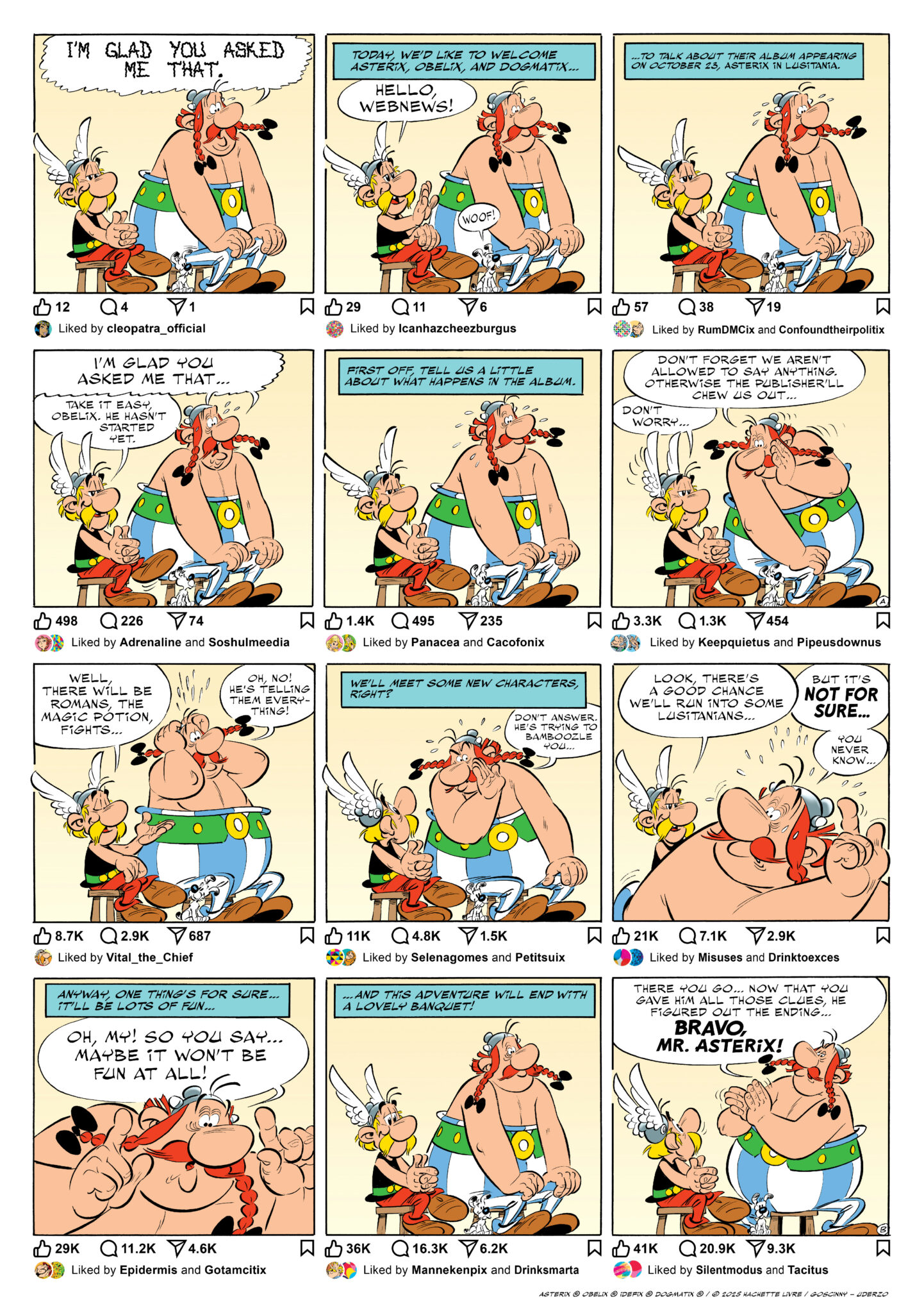 FC. Das ist eine Anspielung auf die Seiten von René Goscinny und Albert Uderzo, die solche Seiten erstellten, um die Vorabveröffentlichung der Abenteuer in der Zeitschrift Pilote anzukündigen. Wir fanden es lustig, dieses System der interviewten Figuren wieder aufzunehmen. Hier haben wir die Codes der sozialen Netzwerke in Videos verwendet, mit schnellen Fragen und Antworten.