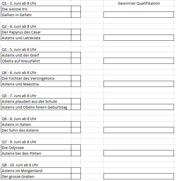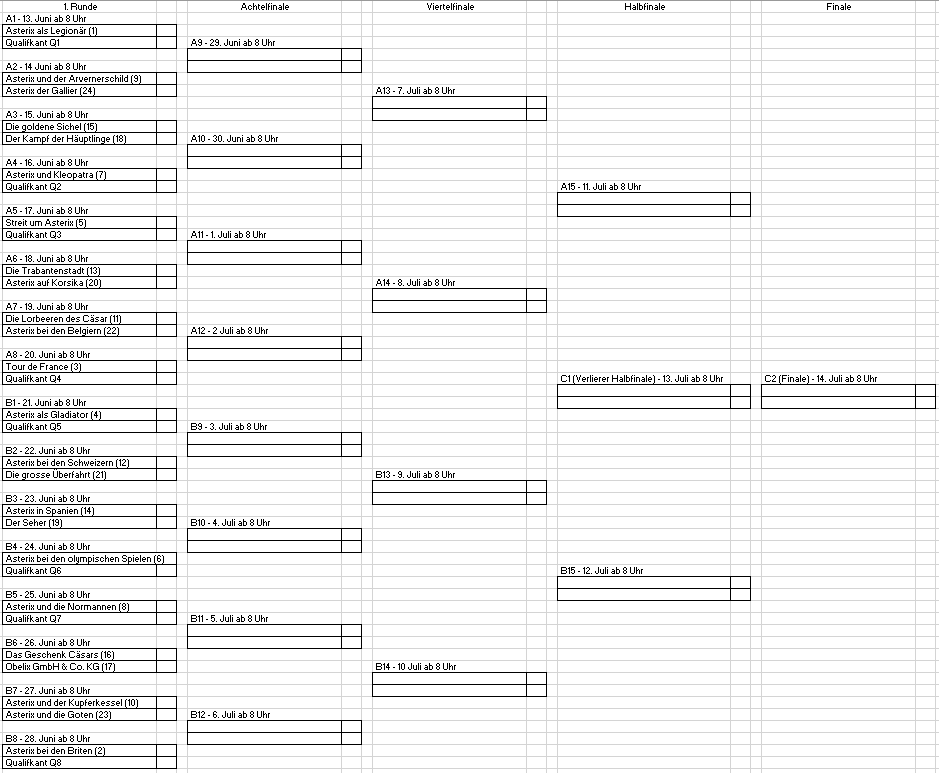 So, am 3. Juni geht es los mit dem Asterix-Abenteuer-Turnier. Hier der Turnierplan. Ab 3. Juni werden ab 8 Uhr täglich die Qualifikanten gewählt. Ihr habt also jeweils 24 Stunden Zeit zur Stimmabgabe. Ab 13. Juni startet die Hauptrunde, das Finale ist dann am 14. Juli.