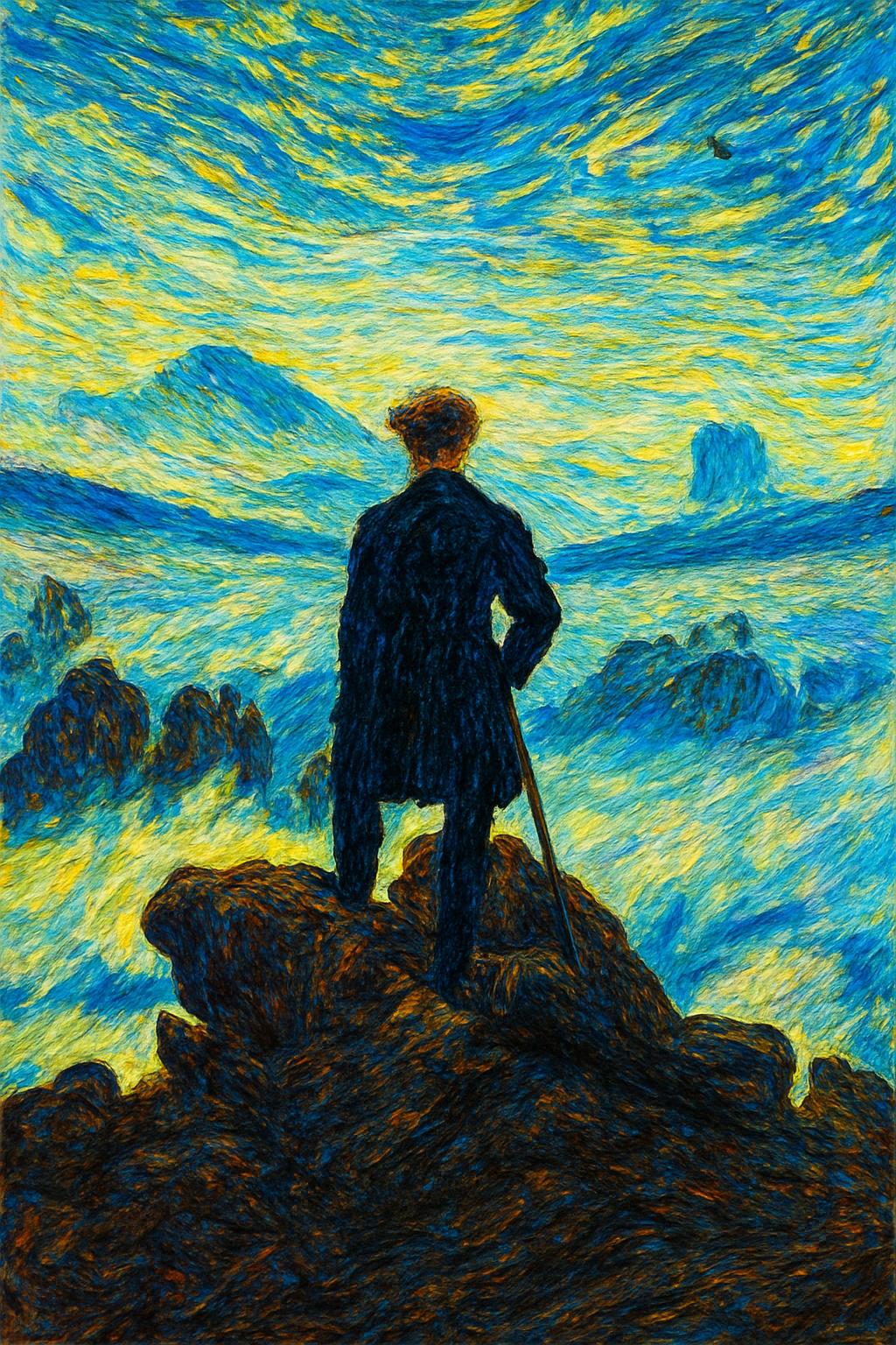 Den Wanderer über dem Nebelmeer von Caspar David Friedrich mit einem Hintergrund im Stile van Goghs? (da wären Urheberrechte ja ohnehin abgelaufen)