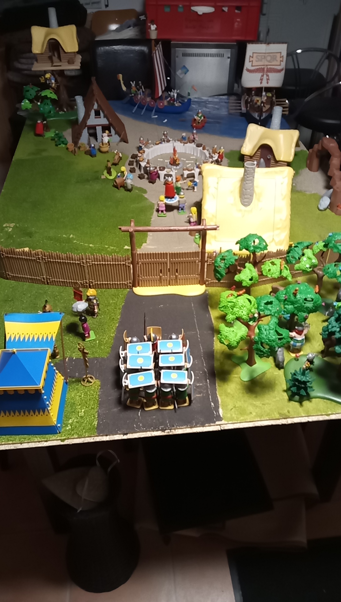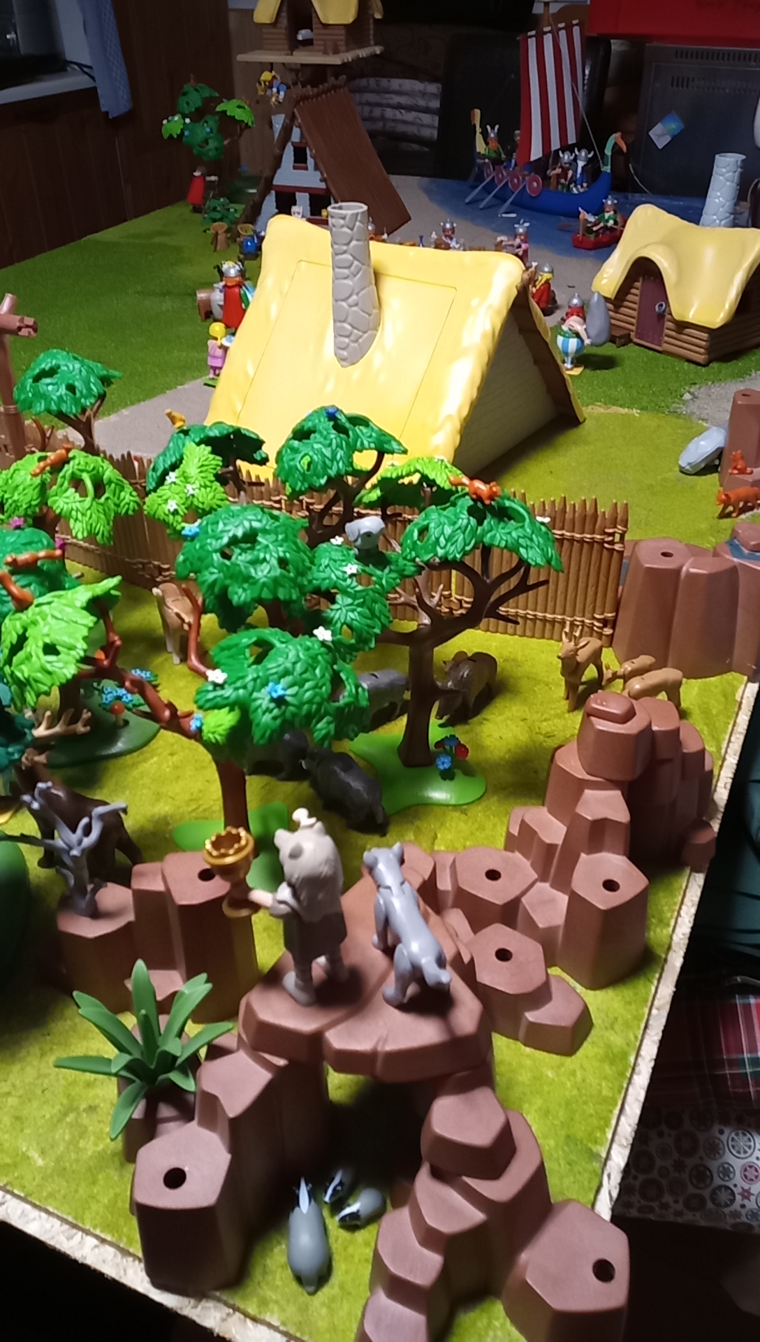 Richtig! Ein geniales Playmo-"Wimmelbild" voller Details, wie Obelix mit den zwei Wildschweinen unter'm Arm! Sogar die raufenden Dorfbewohner und Idefix' Hundehütte sind dabei. Asterix' Hütte auch für Miraculix zu verwenden, ist eine prima Idee. Die wahre Größe des Dorfs fällt erst auf, wenn man sieht, wie winzig der Tischkreis wirkt. Hmm... wenn ich mein Bett durch eine Hängematte ersetze, könnten noch zwei zusätzliche Quadratmeter frei werden. Man muss halt Prioritäten setzen.