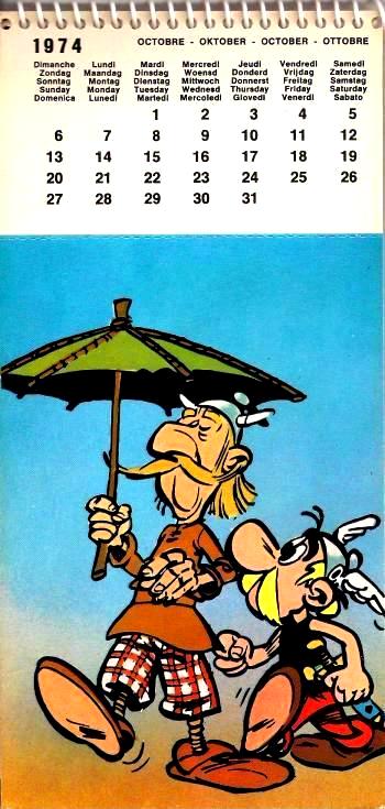 Die dafür verwendeten Karten stammen aus dem (u. a. auch deutschsprachig beschrifteten) Postkarten-Kalender für das Jahr 1974 und stellen dessen 12 monatliche Motive dar (z. B. Monatsblatt des Oktober). Diese Postkarten-Kalender des damaligen Asterix-Verlags Dargaud Editeur waren in den 70er-Jahren wohl die einzigen offiziellen dieser Art (hier z. B. jener für das Jahr 1976) und begründeten eine lange Tradition, die während der 80er- und 90er-Jahre durch die Verlagsgruppe teNeues fortgeführt wurde.