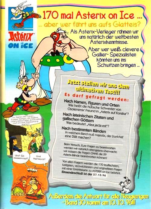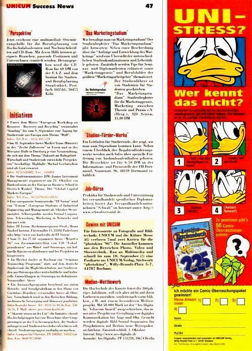 Aufmerksam geworden auf einen "Großen >>ASTERIX ON ICE<< Wissens-Contest" an deutschen Hochschulen, in Kooperation mit dem Ehapa-Verlag, aus den 90er-Jahren und dem Verweis auf dessen Vorstellung in diesem Blatt, habe ich mir nun die Ausgabe Nr. 9/96 des für 2,50 DM/Ausgabe erhältlichen und insb. Absolventen im Jahresabo für 30,- DM angebotenen, direkt an den Universitäten aber kostenlos an Studierende verteilten, Unabhängigen Hochschul-Magazins "UNICUM" besorgt: alle Einsendungen waren zu richten an den UNICUM Verlag, Willy-Brandt-Platz 5-7, 44787 Bochum (und wurden wohl in der Folge an den beteiligten Ehapa-Verlag weitergeleitet), zu gewinnen gab es 170 Eintrittskarten für die Eisrevue. Zusätzlich wurden in dieser Ausgabe noch 66 Comic-Überraschungspakete in einer weiteren Hochschulaktion verlost, der ebenso ein Sponsoring des Ehapa-Verlags zugrundeliegt. – Ich denke mir, diese Zeitschrift ist darum vielleicht auch ein Aufzeigen wert, wenn auch natürlich in keinster Weise zu verwechseln oder gar zu vermengen mit dem bereits bestehenden "uni’kon"-Eintrag in der Bibliothek!