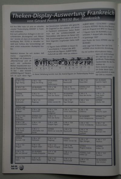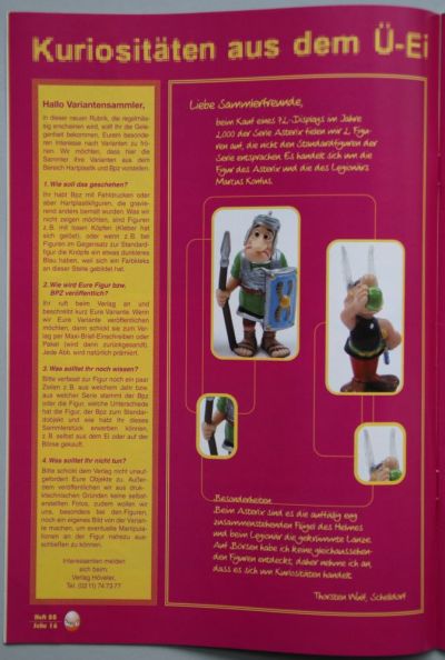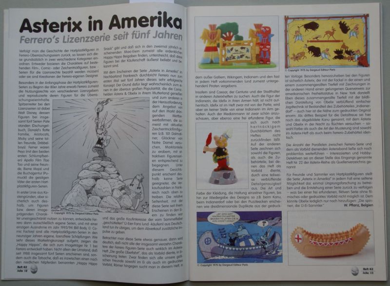 Im bestehenden Eintrag zu "Das Ei" sind schon eine ganze Reihe von Magazinen mit Asterix-Inhalten gelistet. Nichtsdestotrotz gibt es noch einige weitere, die ergänzt werden sollten. Da es europaweit immer wieder Asterix-Serien in verschiedenen Ferrero-Produkten gab, sind die "Das Ei"-Hefte sozusagen voll von Hinweisen auf Asterix-Merchandising. Häufig sind es aber nur Kurznotizen mit wenigen Informationen oder sogar nur Abbildeungen mit der Frage nach weiteren Erkenntnissen. Diese stellen zwar häufig die einzigen gedruckt publizierten Inhalte zu den seltenen Serien dar und können gerade deshalb für Sammler durchaus interessant sein (manche Serien hat man in natura noch nie gesehen). Aber für die Comedix-Bibliothek kann natürlich gleichwohl nicht jede Ausgabe mit einer interessanten Kurznotiz aufnahmefähig sein. Es gilt also zu scheiden, welche Ausgaben ergänzungswürdig sind und welche nicht.