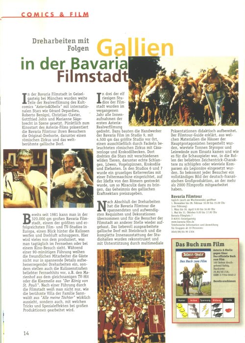 Bei Erwerb eines Tickets zur "Bavaria Filmtour" erhielt man 1999 zur allgemeinen Tour- und Anbindungsinformation (des MVV) das im Anhang abgebildete "Filmschwerpunkt"-Programm in Form eines Falters zur aktuellen (und wie immer didaktisch aufbereiteten) Tour der Bavaria Filmstadt Geiselgasteig, München-Grünwald, zu den Dreharbeiten und Kulissen des Films "Asterix & Obelix gegen Cäsar". - Außerdem wurde dort auch ein "Filmtour-Guide / 1999" mit detaillierten Hintergrund-Informationen zum "Making-Of" dieses Bavaria Films verkauft, sowie noch unsignierte Asterix-Autogrammkarten der deutschsprachigen Stars Gottfried John, Marianne Sägebrecht, Hardy Krüger Jr. und Herbert Fux angeboten. :-)