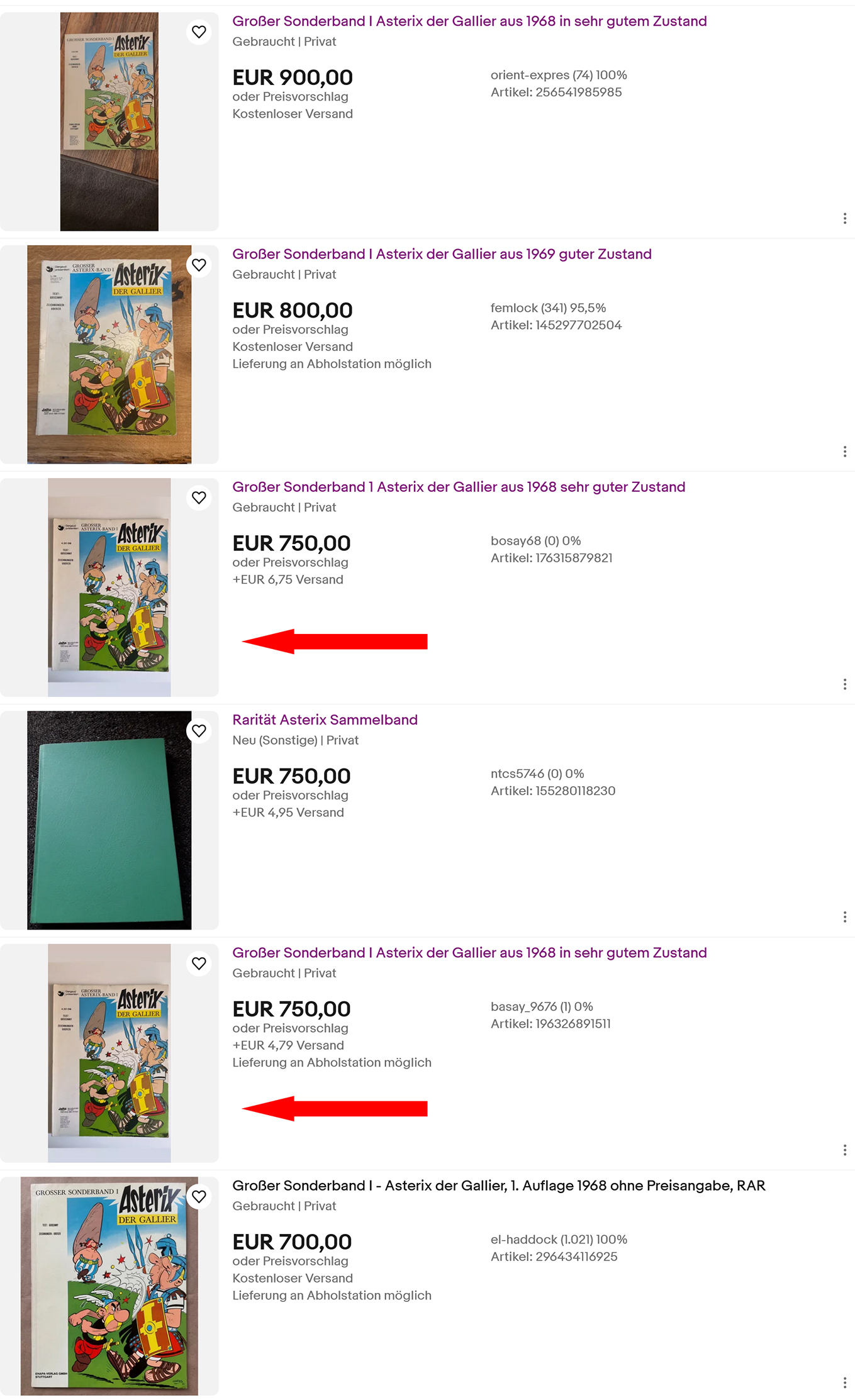 ...bei dem Asterix-Band grenzt die Angabe im Titel ja aber auch schon an Betrug: Der Band ist so weder von 1968 noch in "sehr gutem Zustand"... - und ungelesen, wie in der Artikelbeschreibung angegeben, sieht der mit dem typischen 'Lesewulst' auch nicht aus...
