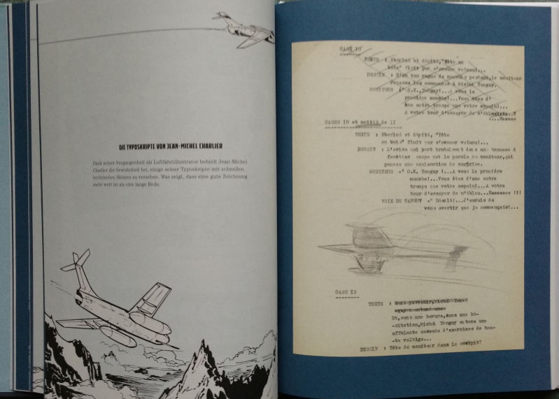Inhaltlich hat mich das Album tatsächlich großteils eher enttäuscht. Die "etwa 40 Seiten" redaktioneller Teil sind nur 34 Seiten. Diese sind vom Text her extrem platzschinderisch gestaltet. Teilweise ist nur ein kurzer, mäßig informativer Absatz auf einer Seite. Hinzu treten sehr viele ganzseitige Abbildungen von Pilote- oder Manuskript-Seiten, die überwiegend nicht mitübersetzt wurden, so dass man als (nur) deutschsprachiger Leser davon verhältnismäßig wenig hat. Eine solche Doppelseite zeige ich hier mal beispielhaft: